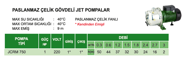 JCRM 750 1.HP 220V PASLANMAZ ÇELİK GÖVDELİ JET POMPA