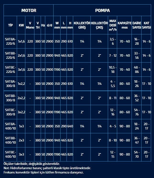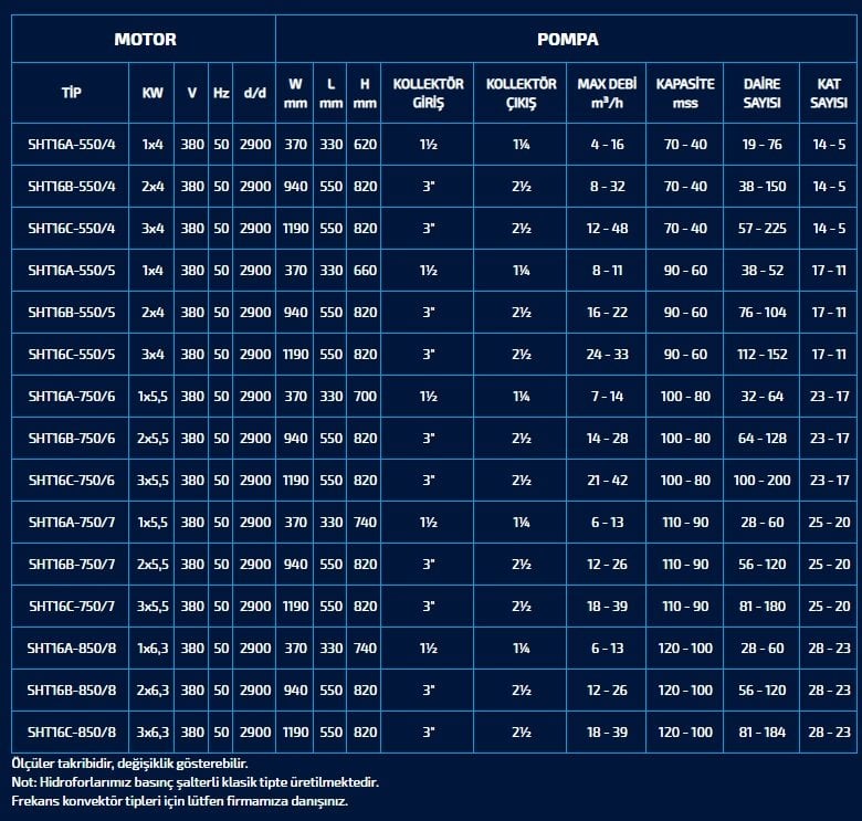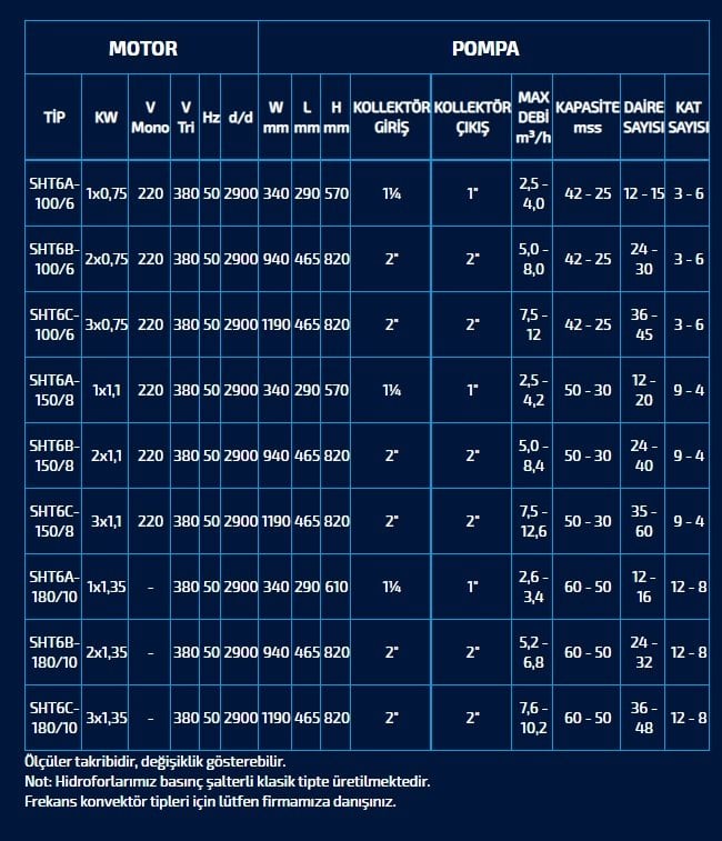 Sumak pompa Hidrofor seçiminde en önemli parametreler hidroforun debisi ve hidroforun basıncı (basma yüksekliği) ile binadaki kat ve daire sayısıdır. Hidrofor emiş yapacaksa kaç metreden yapacağı, kullanılacak suyun ve mevcut elektrik şebekesinin özellikleri hidrofor seçimi için diğer önemli parametrelerdir. Hidrofor sisteminin montaj yapılacağı yer ile beslenecek dairelerin arasında ne kadar mesafe olacağı, yatay ya da dikey gidecek boruların uzunluğu çok iyi hesaplanmalıdır. İhtiyaçlara uygun olarak doğru hidrofor seçimi yapmak hem konforunuzu arttırır hem de ileri de karşılaşılabileceğiniz sorunları minimuma indirir.