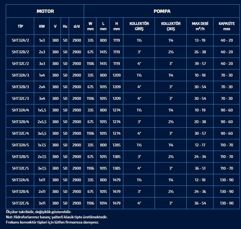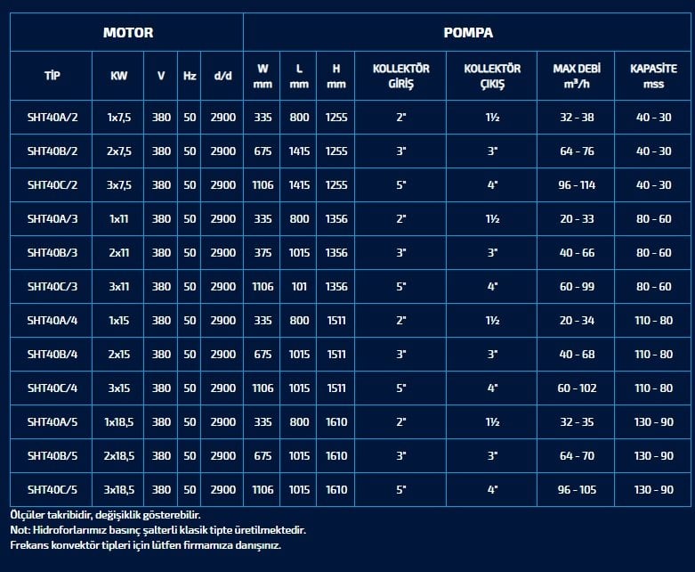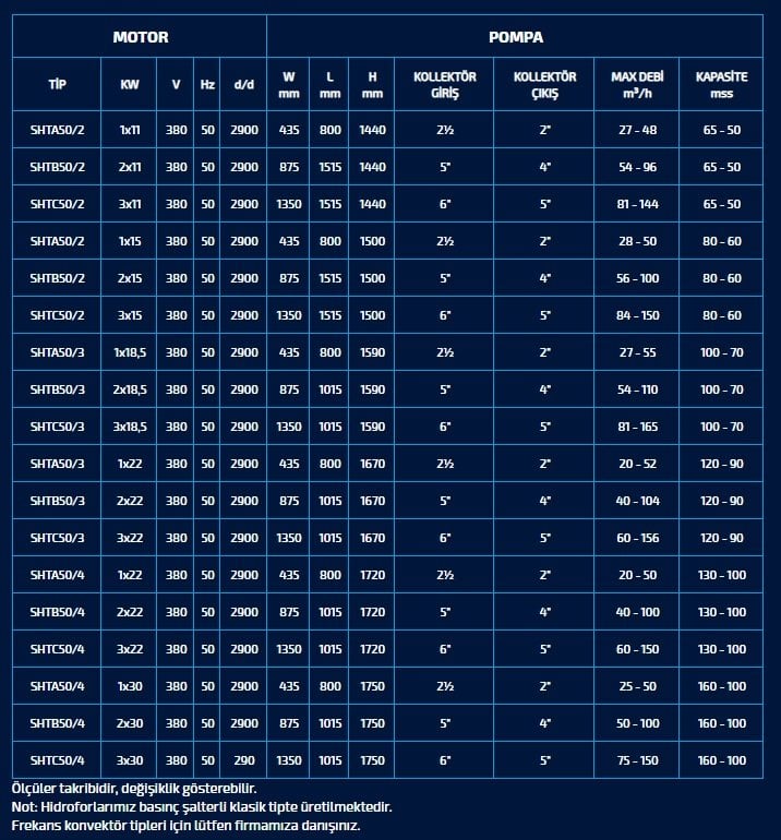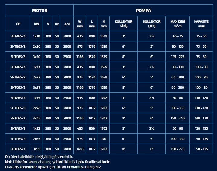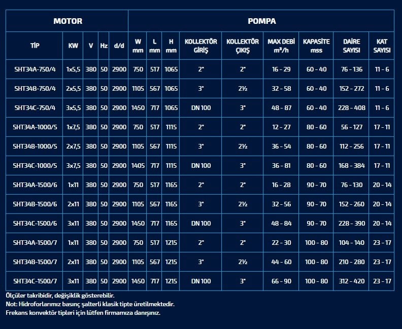 Kademeli Hidroforlar belirlenen basınçlarda ihtiyaca göre düzenli ve sürekli su veren Düşey milli hidrofor sistemleri okul, hastane, işyeri, toplu konut, oteller vb. yerlerde kullanıma uygundur. Her türlü çoklu hidrofor pompa sistemleri ve frekans kontrollü hidrofor isteğiniz için firmamıza danışınız. Kademeli pompa 50 Hz ve 60 Hz frekanslarında imal edilmektedir.